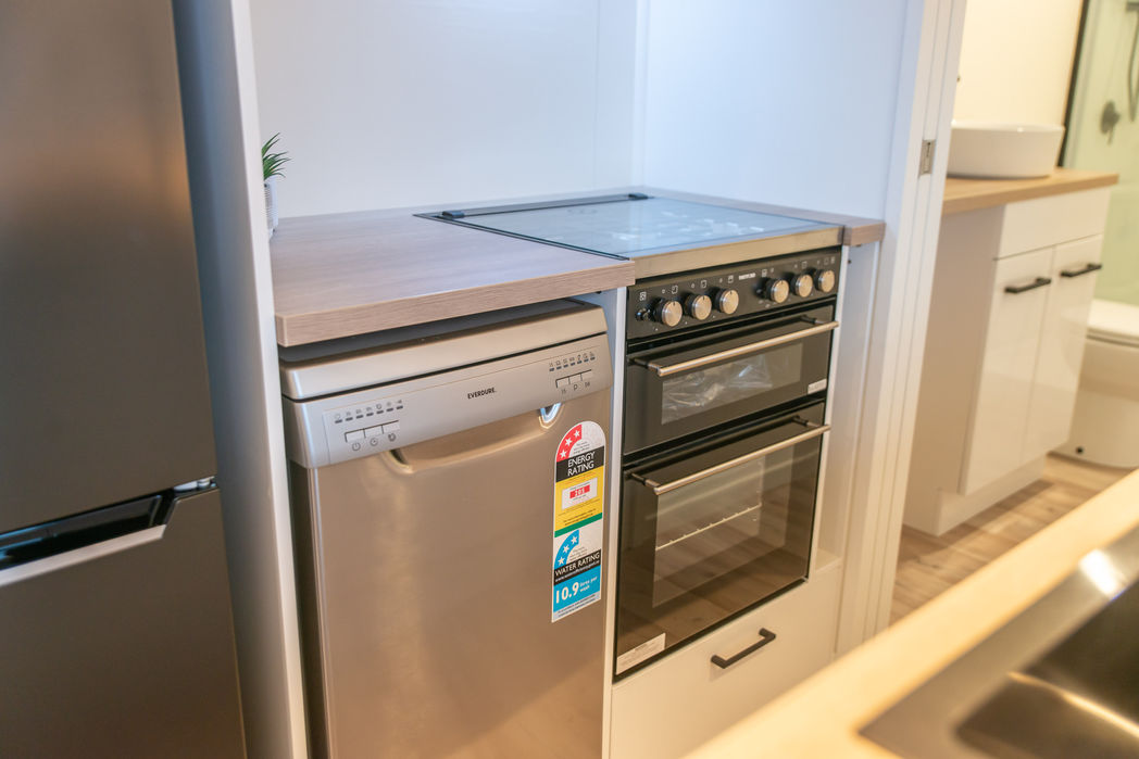 Our best seller, the 10.8m x 3.0m cabin features two bedrooms, full bathroom, and open kitchen/living area.